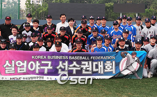 제1회 전국실업야구선수권 대회 개막식 및 본선 경기가 11일 오전 서울 신월야구장에서 열렸다. 한국실업야구연맹이 주최하고 한국야구위원회(KBO), 대한야구협회가 공동후원하는 이번 대회에는 실업연맹 2번째 대회로 소속 4개팀을 비롯해 직장야구팀 16개팀 등 총20개팀이 출전한다. 이중 16개의 직장인 야구팀은 지난 4일과 5일에 예선 토너먼트를 치른 후 홈플러스 게임데이, 경호자동차 쿨웨이브스, KBS, 다나와증권SMBC 카사노바 등 4개팀이 뽑혀 8강에 올라 11-12일 동안 시드배정팀들과 일전을 벌인다. 개막식을 마치고 선수와 감독 및 관계자들이 포토타임을 갖고 있다./민경훈 기자 rumi@osen.co.kr