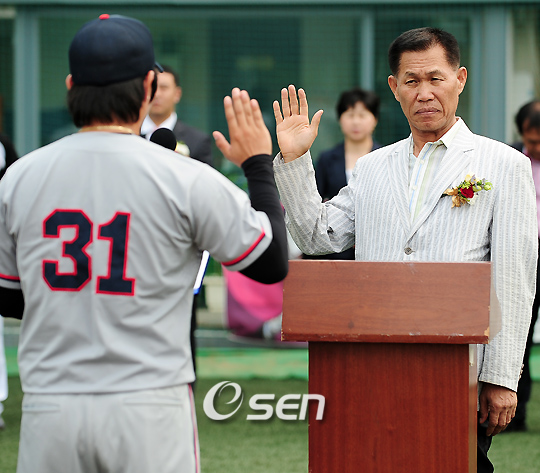 제1회 전국실업야구선수권 대회 개막식 및 본선 경기가 11일 오전 서울 신월야구장에서 열렸다. 한국실업야구연맹이 주최하고 한국야구위원회(KBO), 대한야구협회가 공동후원하는 이번 대회에는 실업연맹 2번째 대회로 소속 4개팀을 비롯해 직장야구팀 16개팀 등 총20개팀이 출전한다. 이중 16개의 직장인 야구팀은 지난 4일과 5일에 예선 토너먼트를 치른 후 홈플러스 게임데이, 경호자동차 쿨웨이브스, KBS, 다나와증권SMBC 카사노바 등 4개팀이 뽑혀 8강에 올라 11-12일 동안 시드배정팀들과 일전을 벌인다. 개막식 중 실업야구연맹 박영길 회장 앞에서 선수 대표가 선서를 하고 있다./신월=민경훈 기자 rumi@osen.co.kr