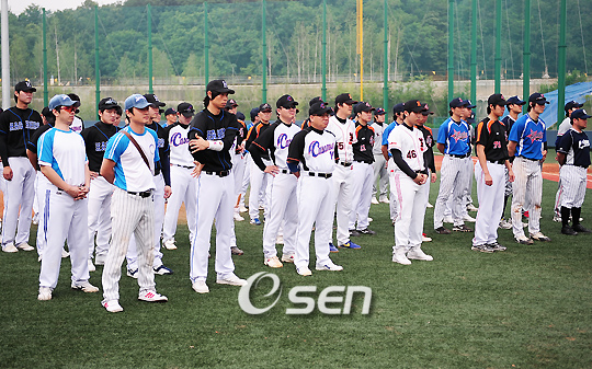 제1회 전국실업야구선수권 대회 개막식 및 본선 경기가 11일 오전 서울 신월야구장에서 열렸다. 한국실업야구연맹이 주최하고 한국야구위원회(KBO), 대한야구협회가 공동후원하는 이번 대회에는 실업연맹 2번째 대회로 소속 4개팀을 비롯해 직장야구팀 16개팀 등 총20개팀이 출전한다. 이중 16개의 직장인 야구팀은 지난 4일과 5일에 예선 토너먼트를 치른 후 홈플러스 게임데이, 경호자동차 쿨웨이브스, KBS, 다나와증권SMBC 카사노바 등 4개팀이 뽑혀 8강에 올라 11-12일 동안 시드배정팀들과 일전을 벌인다. 선수들이 그라운드에 모인 가운데 개막식이 진행되고 있다./신월=민경훈 기자 rumi@osen.co.kr