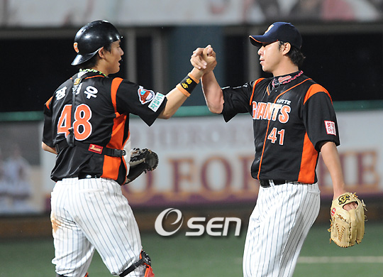 '2009 CJ 마구마구 프로야구' 히어로즈와 롯데 자이언츠 경기가 11일 목동 경기장에서 열려 조정훈의 8이닝 1실점 호투와 홍성흔의 스리런홈런에 힘입어 4-3 승리를 거두었다. 경기 종료후 9회말 무사 1,3루 4-2 상황에서 애킨스에 이어 마무리 등판한 이정훈이 세이브를 추가시키며 장성우 포수와 승리의 기쁨을 나누고 있다./목동=김영민 기자ajyoung@osen.co.kr