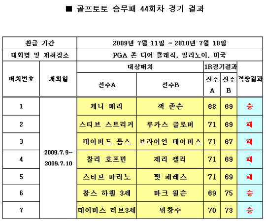 [골프토토] 골프토토 승무패 44회차 적중결과…총 93명 골프팬 7매치 승-무-패 맞혀 케니 페리, 찰스 하웰 3세, 데이비스 러브 3세 '승' 기록 PGA 존 디어 클래식 1라운드를 대상으로 한 골프토토 승무패 44회차 게임에서 총 93명의 적중자가 나왔다. 체육진흥투표권 수탁사업자인 스포츠토토(www.sportstoto.co.kr)는 지난 9일 미국 일리노이에서 개최된 미국프로골프투어(PGA) 존 디어 클래식 1라운드를 대상으로 한 골프토토 승무패 44회차 게임에서 7개 매치를 정확히 맞힌 참가자가 총 93명 나와 각각 베팅금액의 309.7배에 해당하는 적중상금을 가져 가게 됐다고 밝혔다. 상금랭킹 순으로 14명을 선정, 2명씩 7개 매치로 나눠 각 매치별로 1라운드 최종 승-무-패를 예상하는 방식으로 진행된 이번 게임에서 케니 페리-잭 존슨(승), 스티브 스트리커-루카스 글로버(패), 데이비드 톰스-브라이언 데이비스(패), 찰리 호프먼-제니 켈리(패), 스티브 마리노-팻 페리스(패), 찰스 하웰 3세-마크윌슨(승), 데이비스 러브 3세-위창수(승) 등의 결과가 나왔다. 각 매치의 승-무-패를 정확히 맞힌 적중자들 가운데 5000원을 베팅한 1명의 골프팬은 이번 회차 최고액인 154만 8500원 적중상금을 가져 가게 됐다. 또한 최소 베팅액인 100원을 베팅한 55명의 적중자들에게는 각각 3만 970원의 적중상금이 각각 지급된다. 한편 다음 회차인 골트토토 승무패 45회차는 16일 스코틀랜드 에이셔에서 열리는 PGA 브리티시 오픈 챔피언십을 대상으로 발행될 예정이다. '즐거운 스포츠, 즐거운 토토'(http://www.betman.co.kr)