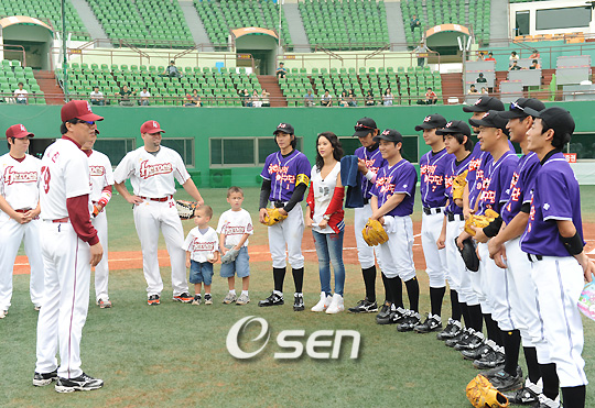KBS 2TV 예능프로그램 '천하무적 토요일' 김창렬, 이하늘, 임창정, 오지호, 마르코, 김준, 한민관, 동호, 마리오 등이 소속되어있는 '천하무적 야구단'이 13일 오후 프로야구 히어로즈 김시진 감독, 정민태,홍원기 코치, 김동수, 이숭용, 브룸바, 황재균 선수들이 참가한 가운데 경기및 훈련을 가졌다. 촬영한 녹화분은 25일 오후 6시 30분 KBS2TV '천하무적 토요일' 프로그램을 통해 방영될 예정이다. 훈련에 앞서 김시진 감독이 '천하무적'선수들과 인사를 나누고 있다./김영민 기자ajyoung@osen.co.kr
