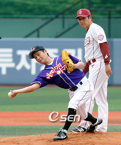KBS 2TV 예능프로그램 '천하무적 토요일' 김창렬, 이하늘, 임창정, 오지호, 마르코, 김준, 한민관, 동호, 마리오 등이 소속되어있는 '천하무적 야구단'이 13일 오후 프로야구 히어로즈 김시진 감독, 정민태,홍원기 코치, 김동수, 이숭용, 브룸바, 황재균 선수들이 참가한 가운데 경기및 훈련을 가졌다. 촬영한 녹화분은 25일 오후 6시 30분 KBS2TV '천하무적 토요일' 프로그램을 통해 방영될 예정이다. 정민태 코치가 임창정의 투구폼을 교정해 주고 있다./김영민 기자ajyoung@osen.co.kr