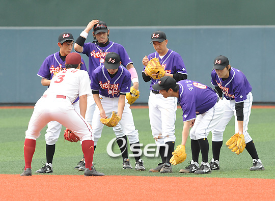KBS 2TV 예능프로그램 '천하무적 토요일' 김창렬, 이하늘, 임창정, 오지호, 마르코, 김준, 한민관, 동호, 마리오 등이 소속되어있는 '천하무적 야구단'이 13일 오후 프로야구 히어로즈 김시진 감독, 정민태,홍원기 코치, 김동수, 이숭용, 브룸바, 황재균 선수들이 참가한 가운데 경기및 훈련을 가졌다. 촬영한 녹화분은 25일 오후 6시 30분 KBS2TV '천하무적 토요일' 프로그램을 통해 방영될 예정이다. 황재균 3루수비수가 '천하무적' 선수들의 수비자세를 지도하고 있다./김영민 기자ajyoung@osen.co.kr