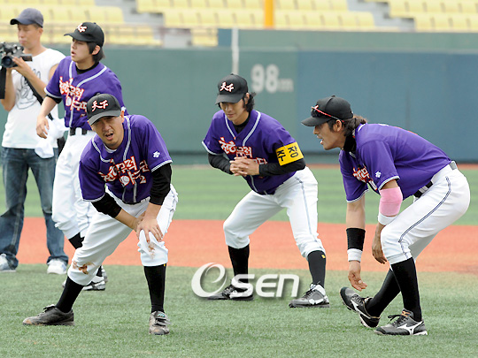 KBS 2TV 예능프로그램 '천하무적 토요일' 김창렬, 이하늘, 임창정, 오지호, 마르코, 김준, 한민관, 동호, 마리오 등이 소속되어있는 '천하무적 야구단'이 13일 오후 프로야구 히어로즈 김시진 감독, 정민태,홍원기 코치, 김동수, 이숭용, 브룸바, 황재균 선수들이 참가한 가운데 경기및 훈련을 가졌다. 촬영한 녹화분은 25일 오후 6시 30분 KBS2TV '천하무적 토요일' 프로그램을 통해 방영될 예정이다. 경기에 앞서 이하늘이 훈련과정에서 고통 스러워하고 있다./김영민 기자ajyoung@osen.co.kr