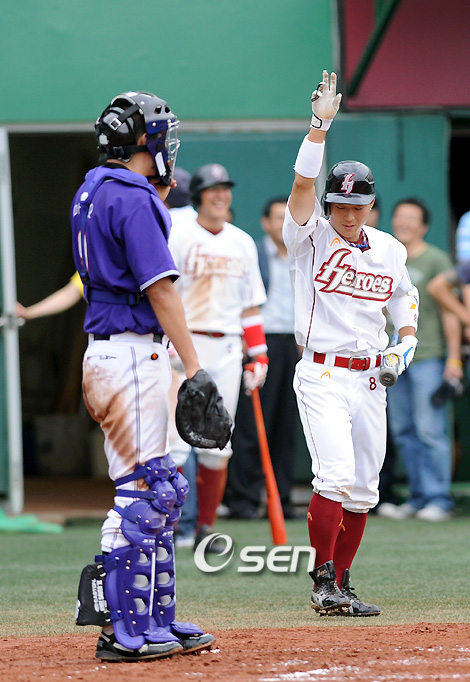 KBS 2TV 예능프로그램 '천하무적 토요일' 김창렬, 이하늘, 임창정, 오지호, 마르코, 김준, 한민관, 동호, 마리오 등이 소속되어있는 '천하무적 야구단'이 13일 오후 히어로즈 김시진 감독, 정민태,홍원기 코치, 김동수, 이숭용, 브룸바, 황재균 선수들이 참가한 가운데 경기및 훈련을 가졌다. 오늘의 경기는 양팀의 실력차가 너무 커서 히어로즈는 6명만 수비에 나서고 타격때 타석 위치를 바꾸는 핸디캡을 적용받기로 했다. 촬영한 녹화분은 25일 오후 6시 30분 KBS2TV '천하무적 토요일' 프로그램을 통해 방영될 예정이다. 1회말 선두타자 정수성이 댄스를 선보이며 타석에 들어서고 있다./김영민 기자ajyoung@osen.co.kr