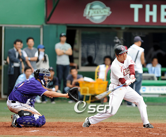 KBS 2TV 예능프로그램 '천하무적 토요일' 김창렬, 이하늘, 임창정, 오지호, 마르코, 김준, 한민관, 동호, 마리오 등이 소속되어있는 '천하무적 야구단'이 13일 오후 히어로즈 김시진 감독, 정민태,홍원기 코치, 김동수, 이숭용, 브룸바, 황재균 선수들이 참가한 가운데 경기및 훈련을 가졌다. 오늘의 경기는 양팀의 실력차가 너무 커서 히어로즈는 6명만 수비에 나서고 타격때 타석 위치를 바꾸는 핸디캡을 적용받기로 했다. 촬영한 녹화분은 25일 오후 6시 30분 KBS2TV '천하무적 토요일' 프로그램을 통해 방영될 예정이다. 2회말 2사 1루 정민태 코치가 3루앞 내야땅볼을 날리고 있다./김영민 기자ajyoung@osen.co.kr