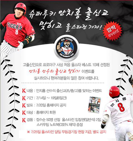 KIA 타이거즈가 고졸신인 최초로 올스타전 베스트10에 선정된 내야수 안치홍(19)의 출신교를 맞히는 홈페이지 깜짝 이벤트를 실시한다. KIA는 14일 오후부터 19일까지 구단 홈페이지(www.tigers.co.kr/)를 통해 안치홍의 초, 중, 고교를 맞히는 '슈퍼루키 안치홍의 출신교 맞히고, 올스타전 가자'라는 이벤트를 실시한다. 이번 이벤트는 고졸신인 최초 및 올스타전 웨스턴리그 최다득표의 영광을 안겨준 팬들에게 감사의 뜻을 전하기 위해 마련된 것으로 구단 홈페이지 회원을 대상으로 실시하며 시상은 정답을 맞힌 응모자 중 접수순으로 50명을 선정, 올스타전 입장권 2장과 스카우팅 노트북(OSEN 제작) 1권을 증정한다. 한편 선정된 50명은 오는 25일 올스타전 당일 무등경기장 야구장에서 티켓과 책자를 증정할 계획이다. 장소는 별도 공지 예정이다. sunny@osen.co.kr KIA 타이거즈 홈페이지 캡처.