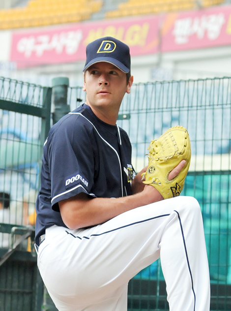 두산 베어스 외국인 좌완 크리스 니코스키(36)가 15일 대구구장에서 열리는 삼성과의 원정 경기에 선발 출격한다. SK서 웨이버 공시된 후 지난달 30일 계약 양도 형태로 두산에 이적한 니코스키는 9일 잠실 SK전이 우천 순연된 후 광주로 떠난 1군 선수단에 합류했다. 아직 1군 엔트리에는 등록되지 않은 상태. SK서 7경기(6⅔이닝)에 등판, 승리없이 2패(방어율 6.75)를 기록한 뒤 방출됐던 니코스키는 7일 이천 베어스필드에서 열린 경찰청과의 2군 경기에 선발 투수로 마운드에 올라 직구 최고 142km를 뿌리며 4이닝 1피안타 5사사구 4탈삼진 무실점을 기록한 바 있다. 김경문 두산 감독은 "준비는 다 끝났다"고 니코스키의 활약에 기대감을 표시했다. 전날 경기에서 14안타를 몰아치며 14-9 낙승을 거둔 두산은 이날 경기에서도 화끈한 타선 지원을 해준다면 니코스키의 첫 등판이 순조롭게 진행될 수 있다. 특히 대구구장에서 펄펄 나는 최준석의 맹타도 관심을 모은다. 전날 경기에서 3타수 3안타 5타점을 포함, 타율 7할7푼3리(22타수 17안타) 3홈런 21타점 6득점 맹타를 휘둘렀다. 이에 맞서는 삼성은 외국인 투수 프란시스코 크루세타를 선발 예고했다. 14일까지 7승 3패(방어율 3.95)로 삼성의 실질적인 에이스 역할을 맡고 있는 크루세타는 150km에 육박하는 직구와 포크볼, 커브 뿐만 아니라 최근 조계현 투수 코치로부터 체인지업과 싱커를 전수받았다. 올 시즌 두산전에서 승리없이 2패(방어율 10.47)로 고전했던 기억을 떨쳐낼지 주목된다. what@osen.co.kr 두산 베어스 제공.
