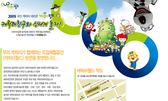 대한민국 국가 대표급 캐릭터가 총출동, 재미와 감동을 전하는 캐릭터 전용 놀이터가 생긴다. 문화체육관광부(장관 유인촌)와 한국콘텐츠진흥원(원장 이재웅)은 16일 서울 광진구 어린이대공원 팔각당에 국산 캐릭터 테마관 ‘캐릭터 월드’를 개관하고 본격적인 운영에 들어간다. ‘캐릭터 월드’는 국내 캐릭터산업의 활성화를 위해 테마파크·라이선스 등을 맺고 놀이공원 내 개관하는 국산 최초의 토종 캐릭터 상설전시·체험공간이다. 이날 오픈 행사는 이재웅 한국콘텐츠진흥원장의 인사말을 시작으로 유병한 문화체육관광부 문화콘텐츠산업실장과 최승호 한국문화콘텐츠 라이센싱협회장의 축사, 테이프 커팅, ‘캐릭터 월드’ 투어 순으로 진행된다. 팔각당 4개층(지하 1층, 지상 2~4층)에 들어서는 ‘캐릭터 월드’는 100여 종의 국산캐릭터를 전시, 체험하는 국산캐릭터 홍보관과 국가 대표급 캐릭터를 본격적으로 탐구하고 체험하는 장으로 구성된다. 별관(지하 1층)에 위치한 ‘국산 캐릭터 홍보관’은 대한민국 국적의 캐릭터 100여종 연대표를 살펴보는 역사관과 캐릭터 의상 렌털숍, 캐릭터 도장 찍기 및 포토존, 수유실 등으로 구성됐다. 2층에 들어서면 도우미를 따라 10여명의 어린이들이 차례로 그룹을 이뤄 탐험을 시작한다. 우주선을 타고 어려움에 빠진 캐릭터를 구출하는 미션을 수행하는데 약 30분의 시간이 소요된다. 3층은 ‘캐릭터마을의 축제날’ 테마로 ‘딸기’ ‘로켓보이와 토로’ ‘마시마로’ ‘토리아드’ ‘빼꼼’ ‘뽀롱뽀롱뽀로로’ ‘제이와 친구들’ ‘깜부’ 등 8개 캐릭터가 입주한 캐릭터 마을이 조성된다. 4층은 캐릭터 관련 상품과 피규어 등 쇼케이스형 전시 및 판매가 이뤄지는 캐릭터숍과 영상실, PC게임실 등을 갖추고 있다. 이곳에 설치한 모니터를 통해 2층 체험실에서 모험을 즐기는 어린이들의 모습을 관찰할 수 있다. 한국콘텐츠진흥원의 이재웅 원장은 “해외는 테마파크, 판권, 주얼리, 라이선스 등 부가 창출로 막대한 수익을 거두고 있다. 반면 국적을 알 수 없는 캐릭터에 밀려 국산 캐릭터를 살펴볼 수 있는 기회가 적어 아쉬웠다. 캐릭터 월드를 통해 다양한 비즈니스 모델을 발굴, 산업화에 기여할 것을 기대한다”며 “서울캐릭터⋅라이선싱페어2009(7월 22~26일, 코엑스)와 연계해 우리 캐릭터가 더 많은 사랑과 관심을 받도록 지원을 아끼지 않겠다”고 밝혔다. 100c@osen.co.kr 캐릭터월드의 인터넷 홈페이지(www.crtworld.co.kr) 초기화면.