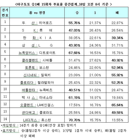 [야구토토] 국내 야구팬들은 국내프로야구 두산 베어스-히어로즈전에서 홈팀 두산의 우세를 전망했다. 스포츠토토 온라인 발매사이트인 베트맨(www.betman.co.kr)은 오는 17일부터 18일(이하 한국시간)까지 벌어지는 국내프로야구 4경기, 미국프로야구 MLB 10경기 등 총 14경기를 대상으로 한 야구토토 승1패 15회차 투표율 중간집계 결과 전체 참가자의 절반이 넘는 55.76%가 두산이 히어로즈의 상승세를 꺾을 것으로 전망했다고 밝혔다. 히어로즈의 승리에 투표한 참가자는 22.87%에 머물렀고, 나머지 21.37%는 양팀의 1점차 박빙승부를 전망했다. 이밖에 국내 프로야구에서는 SK(47.03%)와 KIA(39.34%), 삼성(43.93%)이 각각 롯데(26.54%), 한화(38.05%), LG(31.71%)를 상대로 우세한 경기를 펼칠 것이라는 예상이 다수를 차지했다. 미국프로야구 메이저리그(MLB)에서는 아메리칸 리그 전통의 강호 뉴욕 양키스(67.68%)와 보스턴 레드삭스(52.94%)가 나란히 완승을 거둘 것으로 내다봤다. 올 시즌 좋은 성적을 거두고 있는 텍사스(61.19%)와 LA 에인절스(65.64%), 시애틀(40.92%)는 각각 미네소타(19.84%)와 오클랜드(17.58%), 클리블랜드(31.47%)를 누르고 상승세를 이어갈 것으로 예상한 참가자가 많았다. 내셔날리그에서는 선두권을 형성하고 있는 LA다저스(70.70%)를 비롯해 밀워키(55.92%), 필라델피아(52.25%)등의 승리 예상이 많이 나타났다. 이밖에 애틀란타-뉴욕메츠(10경기)전과 샌디에고-콜로라도(13경기)전에서는 각각 애틀란타(40.51%)와 콜로라도(49.58%)의 우세를 점쳤다. 한편 이번 야구토토 승1패 15회차 게임은 첫번째 경기 시작 10분전인 17일 오후 6시20분에 발매를 마감하며 모든 경기가 종료된 후 결과를 공식 발표한다. '즐거운 스포츠, 즐거운 토토'(http://www.betman.co.kr)
