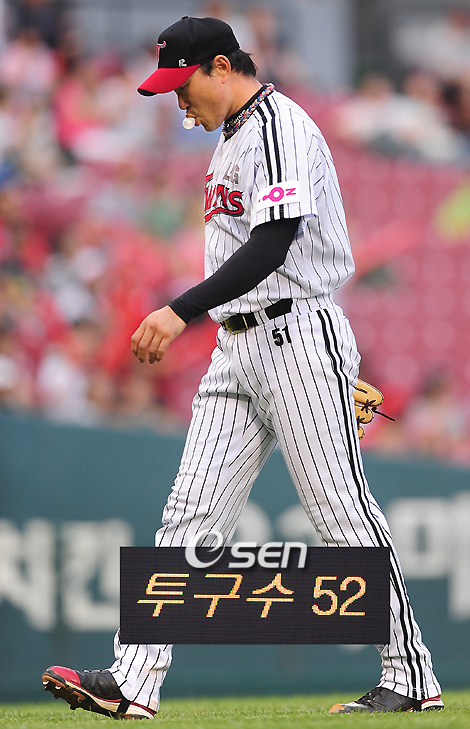 2009 프로야구 LG 트윈스와 SK 와이번즈의 경기가 16일 잠실야구장에서 벌어졌다. 좌완 최고를 다투는 LG 봉중근과 SK 김광현의 맞대결이 벌어지며 SK가 8연패를 벗어날지가 관심거리다. 올시즌 두 투수의 맞대결서는 김광현이 먼저 미소를 지었다. 1회초 2사 1,3루 SK 정상호의 평범한 타구를 LG 유격수 권용관의 야수선택으로 실점을 해 투구수가 급격히 늘어난 봉중근이 1회에만 52개의 공을 던지고 덕아웃으로 가고 있다. /잠실=손용호 기자spjj@osen.co.kr