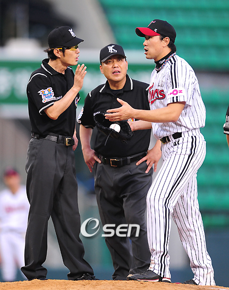 2009 프로야구 LG 트윈스와 SK 와이번즈의 경기가 16일 잠실야구장에서 벌어졌다. 좌완 최고를 다투는 LG 봉중근과 SK 김광현의 맞대결이 벌어지며 SK가 8연패를 벗어날지가 관심거리다. 올시즌 두 투수의 맞대결서는 김광현이 먼저 미소를 지었다. 2회초 봉중근이 투구 전 마운드에서 팔을 흔드는 동작을 연속으로 취하자 나광남 임채섭 심판원이 경기지연과 심판을 기만한다며 주의를 주자 봉중근이 항의하고 있다./잠실=손용호 기자spjj@osen.co.kr