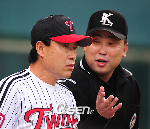 2009 프로야구 LG 트윈스와 SK 와이번즈의 경기가 16일 잠실야구장에서 벌어졌다. 좌완 최고를 다투는 LG 봉중근과 SK 김광현의 맞대결이 벌어지며 SK가 8연패를 벗어날지가 관심거리다. 올시즌 두 투수의 맞대결서는 김광현이 먼저 미소를 지었다. 2회초 봉중근이 투구 전 마운드에서 팔을 흔드는 동작을 연속으로 취하자 원현식 구심이 경기지연과 심판을 기만한다며 주의를 주자 김재박 감독이 항의하고 있다./잠실=손용호 기자spjj@osen.co.kr