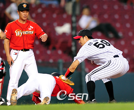 2009 프로야구 LG 트윈스와 SK 와이번즈의 경기가 16일 잠실야구장에서 벌어졌다. 좌완 최고를 다투는 LG 봉중근과 SK 김광현의 맞대결이 벌어지며 SK가 8연패를 벗어날지가 관심거리다. 올시즌 두 투수의 맞대결서는 김광현이 먼저 미소를 지었다. 3회초 1사 1,3루 박재홍의 3루땅볼때 3루주자 김강민이 협살에 걸려 아웃되고 있다./잠실=손용호 기자spjj@osen.co.kr