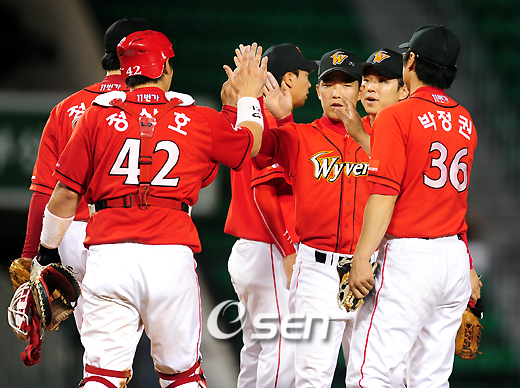 2009 프로야구 LG 트윈스와 SK 와이번즈의 경기가 16일 잠실야구장에서 벌어졌다. 좌완 최고를 다투는 LG 봉중근과 SK 김광현의 맞대결서 김광현이 2연승을 하며 팀의 연패탈출에 힘을 보탰다. SK는 1회초만 상대팀 LG의 기록되지 않은 실책에 편승 6득점을 하며 10-4의 대승을 거둬 7연패 후 귀중한 승리를 챙겼다. SK 선수들이 마운드에 모여 연패탈출의 기쁨을 나누고 있다. /잠실=손용호 기자spjj@osen.co.kr