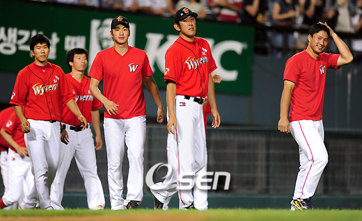 2009 프로야구 LG 트윈스와 SK 와이번즈의 경기가 16일 잠실야구장에서 벌어졌다. 좌완 최고를 다투는 LG 봉중근과 SK 김광현의 맞대결서 김광현이 2연승을 하며 팀의 연패탈출에 힘을 보탰다. SK는 1회초만 상대팀 LG의 기록되지 않은 실책에 편승 6득점을 하며 10-4의 대승을 거둬 7연패 후 귀중한 승리를 챙겼다. SK 김광현이 동료들을 맞이하기 위해 경기장으로 나오고 있다. /잠실=손용호 기자spjj@osen.co.kr