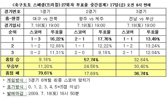 [축구토토] 스포츠토토 공식 온라인 발매 사이트인 베트맨(www.betman.co.kr)는 오는 18일 열리는 대구-전북(1경기), 광주-제주(2경기), 전남-부산(3경기) 등 국내프로축구 K-리그 3경기를 대상으로 하는 축구토토 스페셜 27회차 투표율 중간집계 결과 대구-전북전에서 축구팬의 대다수인 79.61%가 이동국과 에닝요를 앞세운 전북의 승리를 예상했다고 밝혔다. 반면 홈팀 대구의 승리 예상은 9.18%에 불과했고, 나머지 11.20%는 양팀의 무승부를 전망했다. 2경기 광주-제주전의 경우는 최성국 등을 앞세워 리그 2위를 달리고 있는 올 시즌 돌풍의 팀 광주의 승리 예상이 57.74%로 최다를 차지했다. 원정팀 제주의 우세 전망은 17.69%에 머물렀고 24.56%는 양팀이 승부를 가리지 못할 것으로 예상했다. 전남-부산전(3경기)에서는 원정팀 부산의 승리에 투표한 참가자가 36.74%로 집계되고 홈팀 전남의 우세 전망이 32.84%, 무승부가 30.40%로 집계되는 등 양팀의 투표율이 거의 비슷하게 나와 회차 최고의 박빙승부를 예고했다. 베트맨 관계자는 "국내 축구팬들은 이번 주말 벌어지는 K-리그에서 최근 ‘라이언 킹’ 이동국의 부활로 화제를 모으고 있는 전북의 완승에 몰표를 던졌다" 며 "리그 득점 선두 이동국과 도움 선두 에닝요를 앞세운 전북이 원정의 불리함을 딛고 대구에 완승을 거둘 수 있을지 축구팬들의 관심이 집중되고 있다" 고 밝혔다. 한편 이번 축구토토 스페셜 27회차는 경기 시작 10분전인 18일 오후 6시 50분까지 게임에 참여할 수 있다. '즐거운 스포츠, 즐거운 토토'(http://www.betman.co.kr)