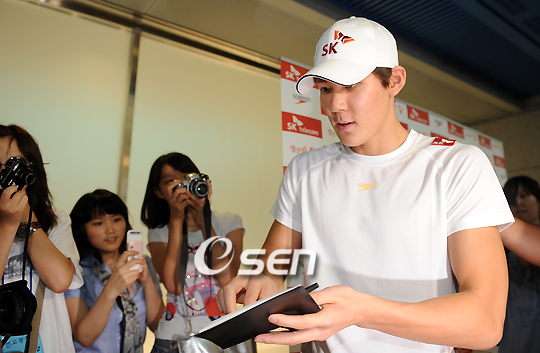 '마린보이' 박태환이 올해 가장 큰 수영대회인 로마 세계선수권이 벌어지는 이탈리아로 17일 오후 인천국제공항을 통해 출국했다. 박태환은 27일 오전 1시 자유형 400m 결승, 29일 오전 1시 200m 결승, 8월 3일 오전 3시 1,500m 결승에 각각 나서 메달에 도전한다. 박태환이 팬에게 사인을 해주고 있다./인천공항=윤민호 기자ymh@osen.co.kr