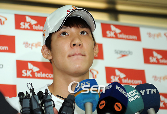 '마린보이' 박태환이 올해 가장 큰 수영대회인 로마 세계선수권이 벌어지는 이탈리아로 17일 오후 인천국제공항을 통해 출국했다. 박태환은 27일 오전1시 자유형 400m 결승, 29일 오전1시 200m 결승, 8월3일 오전 3시에 1,500m 결승에 각각 나서 메달에 도전한다. 박태환이 출국 전 취재진들과 인터뷰를 하고 있다./인천공항=윤민호 기자ymh@osen.co.kr