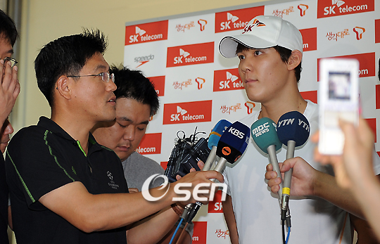 '마린보이' 박태환이 올해 가장 큰 수영대회인 로마 세계선수권이 벌어지는 이탈리아로 17일 오후 인천국제공항을 통해 출국했다. 박태환은 27일 오전 1시 자유형 400m 결승, 29일 오전1시 200m 결승, 8월 3일 오전 3시에 1,500m 결승에 각각 나서 메달에 도전한다. 박태환이 출국 전 취재진들과 인터뷰를 하고 있다./인천공항=윤민호 기자ymh@osen.co.kr