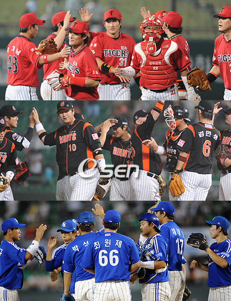 일시적인 현상인가. 판도변화의 예고인가. 3~5위 KIA-롯데-삼성 세 팀이 7월 들어 무서운 상승곡선을 그리면서 프로야구 순위가 요동칠 기미를 보이고 있다. 3위 KIA는 7월에 치른 10경기에서 6승(4패)을 거뒀다. 시즌 44승 35패 4무로 5할3푼의 승률을 기록하며 2위 두산을 바짝 위협하고 있다. 지난 4월 4연패가 시즌 최다연패일 정도로 기복을 보이지 않고 있다. 재미있는 것은 시즌 전체를 놓고 보면 2위 팀방어율(3.88)에 최하위 팀타율(.259)인 KIA지만 7월 한 달 동안은 정반대 행보다. 2할9푼4리로 팀타율 2위지만 팀방어율이 5.42로 6위다. 오히려 마운드의 불안을 타선이 막아주고 있는 셈이다. 우천으로 취소된 경기가 많아 10경기 중 6경기에 두 외국인 투수 구톰슨과 로페즈를 투입할 수 있었다. 4위 롯데는 6월 초반 한 때 승수와 패수가 '-13'에까지 이르렀다. 하지만 6연승에 이어 두 번의 4연승을 거친 롯데는 지난 14일 사직 한화전에서 극적인 5할 승률에 성공했다. 7월 들어 치른 13경기 중 10승 3패를 기록했다. 이 10승 중 2승은 송승준이 거둔 완봉승이다. 무엇보다 마운드와 타선이 균형을 맞추고 있다. 팀방어율 4위(4.61), 팀타율 6위(.274)의 시즌 성적을 기록 중인 롯데지만 이번 달에는 8개 구단 중 가장 좋은 2.82의 팀방어율을 기록하고 있다. 4홀드 5세이브가 포함돼 있어 중간투수들도 탄탄하다. 게다가 중심타선이 무섭게 살아나고 있다는 점은 상승세의 가장 큰 원동력이다. 조성환-이대호-홍성흔-가르시아는 최근 6경기에서 88타수 36안타로 4할9리의 타율을 기록하고 있다. 5홈런과 21타점을 합작해 강한 응집력을 보였다. 특히 롯데는 이 달 들어 SK를 3승 1패로 누르며 순위변동에 돌풍의 핵이 되고 있다. 다음 주에는 두산, 올스타 브레이크가 지난 후에는 KIA를 상대해야 하는 만큼 프로야구 판도에 실마리를 쥐고 있다. 5위 삼성도 무서운 저력을 발휘 중이다. 9승 3패가 7월 성적표다. 6연승으로 5할 승률에 성공하더니 꾸준히 페이스를 유지하고 있다. 선발이 무너진 가운데 '허리'의 힘으로 버티고 있다. 8홀드에 6세이브라는 불펜진의 성적표가 이를 말해주고 있다. 무엇보다 3할1푼1리의 팀타율이 겁날 정도다. 한화(20개)에 이어 두 번째로 많은 18개의 홈런을 때렸고 12경기에서 80득점을 기록 중이다. 팀OPS가 9할1푼7리로 1위다. 채태인(.424) 양준혁(.385) 박한이(.364) 조동찬(.361) 4명이 중심이 되고 최형우와 강봉규는 5개씩의 홈런을 퍼부었다. 상대적으로 SK와 두산의 부진도 이들의 상승세를 부추기도 있다. SK가 4승 8패에 불과했고 두산도 4승(7패)에 그치고 있다. 7월 SK는 팀방어율이 3.84로 롯데에 이은 2위지만 팀타율이 2할7푼7리로 4위다. 가장 좋지 않은 것은 득점권 타율이다. 그나마 좋아진 것이 1할9푼3리다. 장타율(.248)과 출루율(.304) 모두 꼴찌다. 중심타선에 배치된 이호준은 7월 득점권 타율이 '0'다. 두산의 7월 팀방어율(6.36)과 팀타율(.264)이 동시에 7위로 하강곡선을 그리는 중이다. 최근 삼성과 성사시킨 트레이드가 어떤 효력을 발휘할지 궁금하다. KIA, 롯데, 삼성의 상승세가 결국 SK와 두산의 양강체계에 위협을 가하고 있는 만큼 올스타 브레이크 전에 판도변화가 있을지 2009 프로야구가 점점 흥미를 더하고 있다. letmeout@osen.co.kr 위로부터 KIA-롯데-삼성.