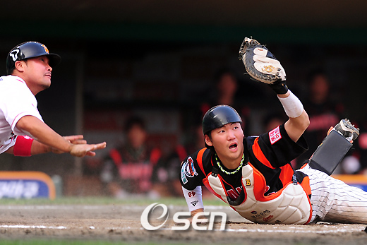 2009 프로야구 SK 와이번즈와 롯데 자이언츠의 경기가 19일 문학야구장에서 벌어졌다. 3회말 2사 1,3루 김강민의 좌익선상 2루타때 1루주자 정경배가 홈으로 쇄도, 롯데 포수 장성우의 태그를 피해 슬라이딩을 하다 홈 베이스를 지나쳐 다시 홈을 태그 세이프 됐다. 정경배와 장성우가 구심의 판정을 기다리고 있다./인천=손용호 기자spjj@osen.co.kr