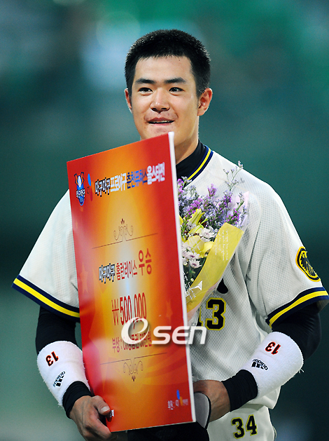 "(오)장훈이 형이 하나 밖에 못쳐서요. 처음부터 긴장했어요".(웃음) 상무에서 기량을 절차탁마 중인 좌타 거포 유망주 김재환(21. 전 두산)이 환한 웃음을 지으며 홈런 레이스 1위에 등극한 소감을 밝혔다. 김재환은 19일 춘천 의암 구장서 벌어진 2009 CJ 마구마구 프로야구 퓨쳐스 올스타전 5회말 종료 후 열린 홈런 레이스 결선(7아웃제)서 5개의 홈런을 때려내며 1개의 아치를 그리는 데 그친 오장훈(25. 롯데)을 제치고 2009 퓨쳐스 홈런 레이스 1위에 올랐다. 올 시즌 2군 북부리그서 2할9푼1리 7홈런 28타점(19일 현재)을 기록 중인 김재환은 이날 경기에 4번 타자 겸 포수로 선발 출장, 3타수 1안타를 기록한 뒤 6회초 수비서 유선정(22. 히어로즈)과 교체되었다. "홈런 레이스를 앞두고 있는데 자신있다"라며 경기 전 호언장담했던 김재환은 약속을 그대로 지켜보였다. 수상 후 덕아웃에서 만난 김재환은 "앞에서 장훈이 형이 1개 밖에 못 쳐서 '하나도 못 치면 어쩌나'라는 생각이 들었다"라고 밝혔다. 예선서 3개의 우월 라인 드라이브성 홈런을 때려낸 데 비해 결선서 때린 5개의 홈런 중 3개는 우중간으로 뻗어나갔다. 그에 대해 묻자 김재환은 "타석에 들어서기 전 긴장으로 인해 배트가 늦게 나왔다"라고 밝혔다. 군인 신분이라 연봉 100만원이 안되는 김재환은 현금 50만원에 50만원 상당의 CJ 상품권을 받았다. '자대 복귀해서 전우들에게 크게 쏘는 것이 아니냐'라고 묻자 김재환은 "어떻게 쓸 지는 아직 모르겠다"라며 수줍게 웃었다. farinelli@osen.co.kr '2009 CJ 마구마구 프로야구' 퓨처스 올스타전 경기가 19일 오후 강원도 춘천의암구장에서 열렸다. 홈런 레이스 결승에서 우승한 북부 김재환이 환한 미소 짓고 있다./춘천=윤민호 기자ymh@osen.co.kr