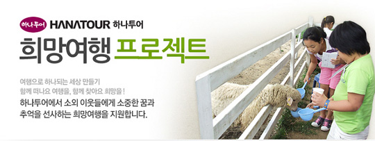 하나투어, 2009 희망여행 프로젝트 진행 하나투어가 ‘여행으로 하나되는 세상’을 만들기 위한 ‘2009년 하나투어 희망여행 프로젝트’를 진행한다. 하나투어 희망여행 프로젝트는 하나투어가 수익의 일부분을 연중 적립한 ‘희망여행기금’을 2005년부터 사회복지단체의 저소득층 소외 아동과 청소년들에게 여행을 지원해주는 사회공헌사업이다. 소외 아이들에게 단순 물질적 지원이 아니라 여행을 통해 잃어버린 꿈과 희망을 다시 찾는 소중한 기회를 제공하는 프로그램으로 해를 거듭할수록 전국 사회복지 단체의 관심과 지원이 늘어나고 있다. 올해 희망여행 프로젝트는 지원자격을 기존 아동·청소년 단체에서 저소득층 다문화 가정으로 확대해 참여의 폭을 넓혔으며 지원규모도 확대했다. 이번 프로젝트를 통해 아동 및 청소년 단체는 문화체험과 함께 타 지역의 새로운 친구를 사귀는 여행을, 다문화 가정 참가자는 대한민국의 아름다움을 느끼는 여행을 하게 된다. 이번 프로젝트에 참여를 희망하는 단체는 오는 27일까지 네이버 해피빈(happybean.naver. com)의 하나투어 희망여행 프로젝트 페이지에서 각 대상별 참가신청서를 다운로드받아 신청서에 첨부된 예시 일정표 중 1개를 골라 여행계획서를 작성해 등록하면 된다. 하나투어는 심사를 거쳐 다음달 3일 최종 6개 단체를 선정, 아동·청소년 단체에게는 500만원 상당의 1박2일 국내 맞춤여행을, 다문화 가정 참가자에게는 250만원 상당의 국내 당일여행을 제공한다. 권희석 하나투어 대표이사 사장은 “여행을 통해 새로운 꿈을 찾은 아이들을 보며 뿌듯함을 느끼는 동시에 대한민국 대표 여행기업으로서 더 많은 소외 이웃들에게 희망 여행을 선사해 줘야 할 책임감을 느낀다”며 “앞으로도 하나투어는 여행을 통해 구석진 세상 곳곳에 희망 바이러스를 전파할 수 있도록 더욱 노력하겠다”고 밝혔다. 여행미디어 주성희 기자 www.tourmedia.co.kr
