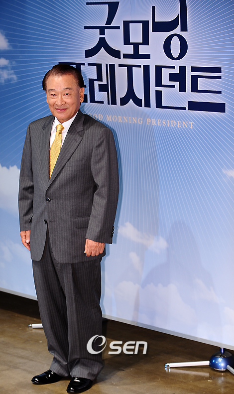 영화 '굿모닝 프레지던트' 현장공개 행사 및 기자회견이 20일 경기도 파주시 탄현면 아트 서비스 세트장에서 열렸다. 이 영화는 톱스타 장동건의 영화'태풍' 이후의 4년 만의 스크린 컴백작으로 임기 말 복권에 당첨된 나이든 대통령(이순재)과 젊고 카리스마 넘치는 대통령(장동건), 한국 최초의 여성 대통령(고두심) 등 대통령들의 얘기를 다룬 작품이다. 또한 '바비인형' 한채영은 최고의 지성과 미모를 겸비한 미모의 야당 대변인으로 분해 장동건과의 러브라인을 그린다. 이 영화는 각기 다른 대통령의 모습에 대한 장진 감독 특유의 풍자적 해석과 소재의 파격성으로 제작 단계부터 큰 화제를 모으고 있다. 배우 이순재가 기자회견을 마치고 포토타임을 갖고 있다./파주=민경훈 기자 rumi@osen.co.kr