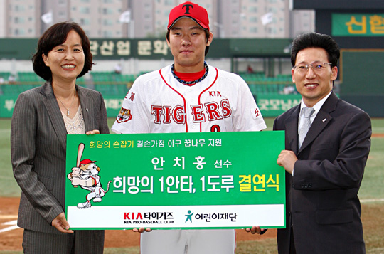 사상 첫 고졸루키 올스타 베스트에 선정된 KIA 내야수 안치홍(19)이 선행에 나선다. 안치홍은 21일 광주 LG전에 앞서 광주·전남 어린이 재단과 결연식을 맺고 후원금을 적립해 경제적으로 어려움을 겪고 있는 아동들을 지원한다. 앞으로 1안타 및 1도루당 1만 원씩 후원금을 적립, 시즌을 마친 뒤 결연 아동에게 지원한다. KIA 구단도 안치홍의 뜻에 동참하기 위해 안치홍이 적립한 액수만큼 후원금을 내기로했다. 팀 지정병원인 '밝은안과 21'도 동참하기로 했다. 고졸루키로 입단 첫 해부터 선행에 나서기는 흔치 않은 일이다. 팬들의 전폭적인 지지를 받아 고졸루키 사상 첫 올스타 베스트에 뽑히는 등 주목받게 되자 자연스럽게 선행으로 이어졌다. 안치홍은 "올스타 베스트 10에 뽑히는 등 팬들의 사랑을 보답하기 위해 고민하다 더 좋은 성적을 올릴 수 있는 계기를 만들고, 좋은 일을 하고 싶어 후원금을 적립하게 됐다"고 말했다. 아울러 "어린이 재단으로부터 야구를 좋아하는 어린이들이 있다고 들었다. 후반기에 결연을 맺은 어린이들도 야구장에 초청, 꿈과 희망을 안겨주고 싶다"고 말했다. sunny@osen.co.kr 21일 광주 LG전에 앞서 안치홍이 어린이재단 최삼영 광주지역본부장(오른쪽), 김은영 전남지역본부장과 결연식을 맺고 기념사진을 찍고 있다./KIA 타이거즈 제공