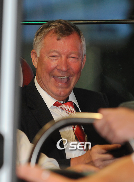박지성이 활약하고 있는 잉글랜드 프리미어리그의 맨체스터 유나이티드가 24일 서울월드컵경기장에서 벌어질 FC 서울과의 친선 경기를 위해 한국을 방문했다. EPL서 세 해 연속 리그 우승을 차지한 맨유는 2007년에 이어 한국을 두 번째 방문했다. 맨유의 알렉스 퍼거슨 감독이 버스에 올라 핸드폰을 조작하며 환한 미소를 지어보이고 있다./인천공항=김영민 기자ajyoung@osen.co.kr