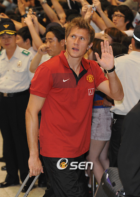 박지성이 활약하고 있는 잉글랜드 프리미어리그의 맨체스터 유나이티드가 24일 서울월드컵경기장에서 벌어질 FC 서울과의 친선 경기를 위해 한국을 방문했다. EPL서 세 해 연속 리그 우승을 차지한 맨유는 2007년에 이어 한국을 두 번째 방문했다. 맨유의 골키퍼 쿠시착이 손을 흔들어 인사하며 입국장을 나서고 있다./인천공항=김영민 기자ajyoung@osen.co.kr