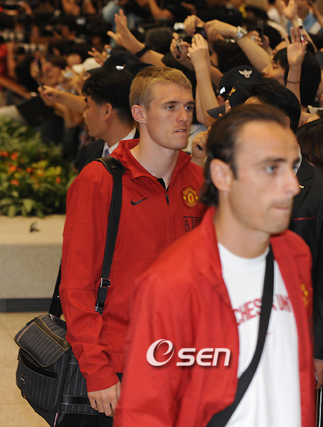 박지성이 활약하고 있는 잉글랜드 프리미어리그의 맨체스터 유나이티드가 24일 서울월드컵경기장에서 벌어질 FC 서울과의 친선 경기를 위해 한국을 방문했다. EPL서 세 해 연속 리그 우승을 차지한 맨유는 2007년에 이어 한국을 두 번째 방문했다. 맨유의 플레처가 베르바토프에 이어 입국장을 나서고 있다./인천공항=김영민 기자ajyoung@osen.co.kr