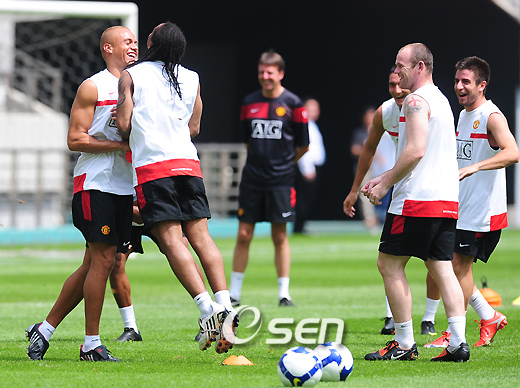 24일 서울월드컵경기장에서 벌어질 FC 서울과의 친선 경기를 위해 22일 한국을 방문한 잉글랜드 프리미어리그의 맨체스터 유나이티드가 23일 오전 공식훈련을 가졌다. EPL서 세 해 연속 리그 우승을 차지한 맨유는 2007년에 이어 한국을 두 번째 방문했다. 웨스 브라운(왼쪽)과 안데르손이 몸을 부딪치며 즐겁게 훈련하고 있다. /상암=손용호 기자spjj@osen.co.kr