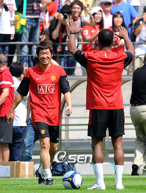 24일 서울월드컵경기장에서 벌어질 FC 서울과의 친선 경기를 위해 22일 한국을 방문한 잉글랜드 프리미어리그의 맨체스터 유나이티드가 23일 오전 공식훈련을 가졌다. EPL서 세 해 연속 리그 우승을 차지한 맨유는 2007년에 이어 한국을 두 번째 방문했다. 박지성이 훈련장에 입장하자 에브라가 마치 큰 절을 하듯 장난을 치고 있다. /상암=손용호 기자spjj@osen.co.kr