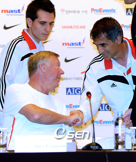 24일 서울월드컵경기장에서 벌어질 FC 서울과의 친선 경기를 위해 22일 한국을 방문한 잉글랜드 프리미어리그의 맨체스터 유나이티드가 23일 오전 서울 월드컵경기장에서 공식훈련을 마친후 오후 신라호텔에서 양팀 감독및 대표 선수가 기자회견을 가졌다. EPL서 세 해 연속 리그 우승을 차지한 맨유는 2007년에 이어 한국을 두 번째 방문했다. 맨유 퍼거슨 감독과 FC 서울 귀네슈 감독이 인사를 나누고 있다./신라호텔=김영민 기자ajyoung@osen.co.kr