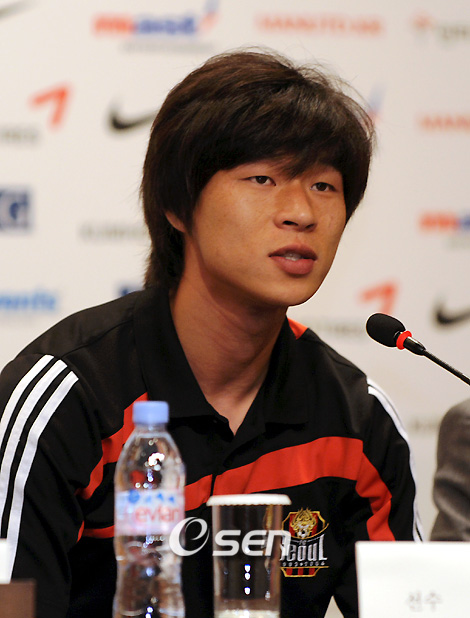 24일 서울월드컵경기장에서 벌어질 FC 서울과의 친선 경기를 위해 22일 한국을 방문한 잉글랜드 프리미어리그의 맨체스터 유나이티드가 23일 오전 서울 월드컵경기장에서 공식훈련을 마친 뒤 오후 신라호텔에서 FC 서울과 함께 감독 및 대표 선수 기자회견을 가졌다. EPL서 세 해 연속 리그 우승을 차지한 맨유는 2007년에 이어 한국을 두 번째 방문했다. FC 서울 주장 김치곤이 인사말을 하고 있다./신라호텔=김영민 기자ajyoung@osen.co.kr