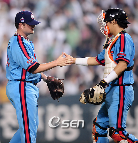 2009 CJ 마구마구 프로야구' 두산 베어스와 롯데 자이언츠의 경기가 23일 잠실 구장에서 벌어졌다. 이 날 경기에서 롯데는 선발 조정훈의 6이닝 2실점 호투와 3회서만 대거 6점을 뽑아낸 타선의 집중력에 힘입어 두산에 6-4로 승리를 거뒀다. 경기를 마치고 롯데 애킨스와 장성우가 기쁨을 나누고 있다./잠실=민경훈 기자 rumi@osen.co.kr