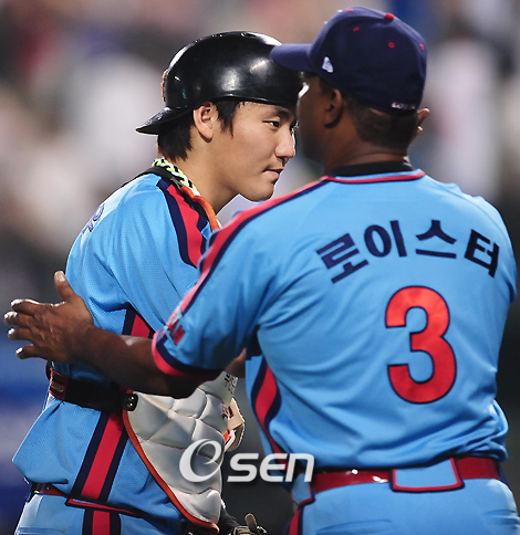 2009 CJ 마구마구 프로야구' 두산 베어스와 롯데 자이언츠의 경기가 23일 잠실 구장에서 벌어졌다. 이 날 경기에서 롯데는 선발 조정훈의 6이닝 2실점 호투와 3회서만 대거 6점을 뽑아낸 타선의 집중력에 힘입어 두산에 6-4로 승리를 거뒀다. 경기를 마치고 롯데 장성우 포수와 로이스터 감독이 기쁨을 나누고 있다./잠실=민경훈 기자 rumi@osen.co.kr
