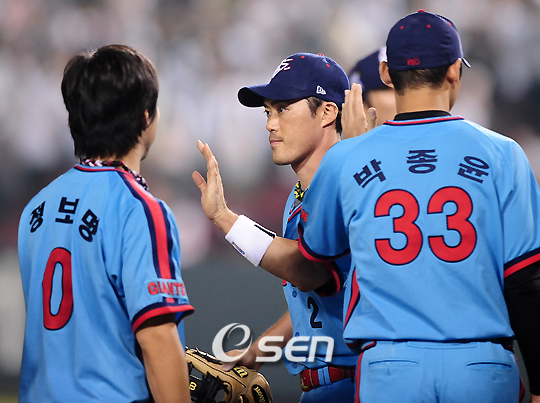 2009 CJ 마구마구 프로야구' 두산 베어스와 롯데 자이언츠의 경기가 23일 잠실 구장에서 벌어졌다. 이 날 경기에서 롯데는 선발 조정훈의 6이닝 2실점 호투와 3회서만 대거 6점을 뽑아낸 타선의 집중력에 힘입어 두산에 6-4로 승리를 거뒀다. 경기를 마치고 롯데 조성환이 동료들과 기쁨을 나누고 있다./잠실=민경훈 기자 rumi@osen.co.kr