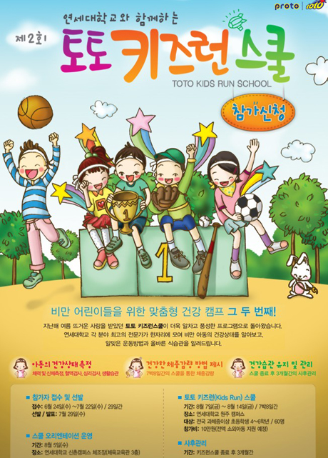 '건강한 대한민국 만들기' 비만아동 줄이기 프로젝트 8월 7일 부터 연세대 원주캠퍼스에서 개최…올바른 식습관, 운동습관 등 배양 체육진흥투표권 수탁사업자인 스포츠토토(www.sportstoto.co.kr)는 비만 아동 인구를 줄이기 위한 프로젝트의 일환으로 실시하는 과체중 어린이 대상 '토토 키즈런 스쿨' 모집이 뜨거운 열기 속에 접수 마감 됐다고 밝혔다. '토토 키즈런 스쿨'은 연세대 스포츠의학 연구실과 함께 프로그램을 마련해 과체중 아동들에게 신체 활동을 통한 체중감소, 올바른 식습관 형성, 심리치료 등을 통해 아동 비만 인구를 줄이고 건강한 신체의 중요성을 심어주기 위한 것을 목적 올해 2회째를 맞는다. 연세대학교 원주캠퍼스에서 열리는 이번 '토토 키즈런 스쿨'은 오는 8월 5일 오리엔테이션을 시작으로 8월 7일부터 14일까지 7박 8일의 일정으로 진행된다. 미니축구, 농구 수중운동, 건강 과학교실, 영양교실, 행동 수정 프로그램등으로 구성돼 어린이들이 재미있게 운동을 접근할 수 있게 할 예정이다. 참가 대상자는 전국 초등학교 4~6학년 과체중 이상 학생 중 60명을 대상으로 선발하며, 참가비는 1인당 10만원(교육비, 보험, 식비 포함)이다. 참가비는 어린이 재단을 통해 전액 소외 계층 아동을 지원하는데 전액 기부 될 예정이다. 스포츠토토 관계자는 "2회째를 맞는 '키즈런 스쿨'에 1년을 기다려 응모하는 어린이들이 있을 정도로 호응이 높아 60명 정원에 118명의 사연이 접수 되는 등 참여열기가 높았다"며 "이번 캠프를 성공적으로 마쳐 비만아동 인구를 줄이고 앞으로 대한민국을 이끌어 나갈 어린이들이 건강하게 자랄 수 있는데 도움이 되었으면 좋겠다"고 말했다. '즐거운 스포츠, 즐거운 토토'(http://www.betman.co.kr)