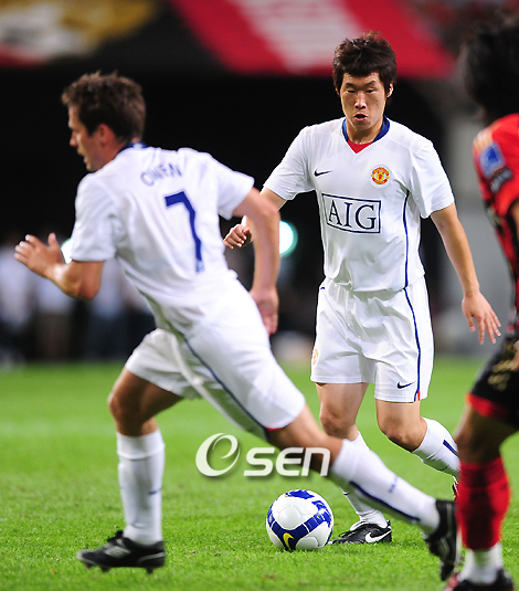 박지성이 활약하고 있는 잉글랜드 프리미어리그 맨체스터 유나이티드와 FC 서울의 친선경기가 24일 서울월드컵 경기장에서 벌어져 맨유가 루니 마케다 베르바토프의 연속골로 데얀이 두 골로 분전한 서울을 3-2로 물리쳤다. 이날 경기는 맨유의 2009 아시아투어 3차전이다. 후반 교체멤버로 들어온 박지성이 공을 잡자 오웬이 빈 공간으로 침투하고 있다./상암=손용호 기자 spjj@osen.co.kr