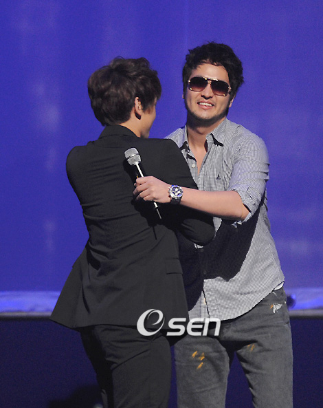 가수 겸 연기자인 만능 엔터데이너 비(본명:정지훈)가 아시아투어를 앞두고 26일 경희대 평화의 전당에서 '2009 Rain’s global Fan Meeting in Seoul'로 아시아 각지에서 모여든 3천여 팬들을 열광시켰다, 방송인 김제동의 사회로 'Rain Theater' 이라는 주제로 무대를 극장식으로 대형 스크린을 설치해 그 동안 보지 못했던 비의 미공개 파일 영상과 토크 형식으로 꾸며졌다. 비의 팬미팅에 첫 게스트로 참석한 김태우가 비와 포옹하고 있다./김영민 기자ajyoung@osen.co.kr
