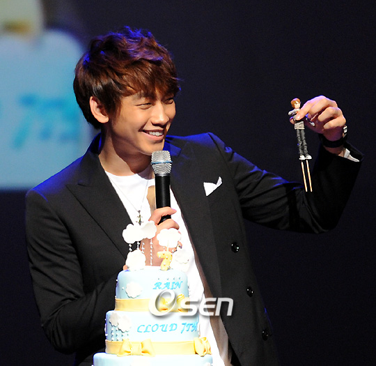가수 겸 연기자인 만능 엔터데이너 비(본명:정지훈)가 아시아투어를 앞두고 26일 경희대 평화의 전당에서 '2009 Rain’s global Fan Meeting in Seoul'로 아시아 각지에서 모여든 3천여 팬들을 열광시켰다, 방송인 김제동의 사회로 'Rain Theater' 이라는 주제로 무대를 극장식으로 대형 스크린을 설치해 그 동안 보지 못했던 비의 미공개 파일 영상과 토크 형식으로 꾸며졌다. 비가 생일케익 앞에서 마스코트를 보면서 키높이 신발을 신었다며 익살스러운 이야기를 하고 있다./김영민 기자ajyoung@osen.co.kr
