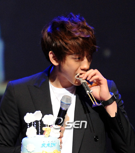 가수 겸 연기자인 만능 엔터데이너 비(본명:정지훈)가 아시아투어를 앞두고 26일 경희대 평화의 전당에서 '2009 Rain’s global Fan Meeting in Seoul'로 아시아 각지에서 모여든 3천여 팬들을 열광시켰다, 방송인 김제동의 사회로 'Rain Theater' 이라는 주제로 무대를 극장식으로 대형 스크린을 설치해 그 동안 보지 못했던 비의 미공개 파일 영상과 토크 형식으로 꾸며졌다. 비가 생일케익 위에 있는 마스코트를 입에 넣어보이고 있다./김영민 기자ajyoung@osen.co.kr