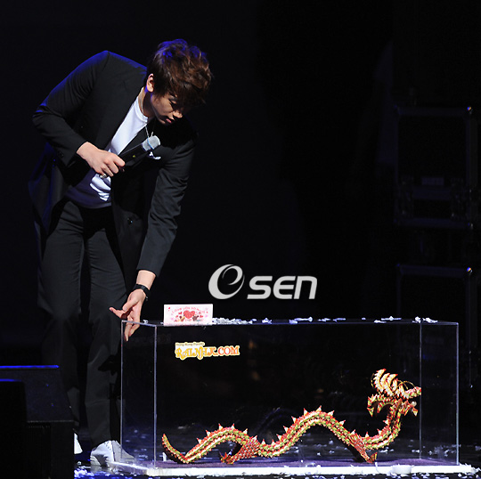 가수 겸 연기자인 만능 엔터데이너 비(본명:정지훈)가 아시아투어를 앞두고 26일 경희대 평화의 전당에서 '2009 Rain’s global Fan Meeting in Seoul'로 아시아 각지에서 모여든 3천여 팬들을 열광시켰다, 방송인 김제동의 사회로 'Rain Theater' 이라는 주제로 무대를 극장식으로 대형 스크린을 설치해 그 동안 보지 못했던 비의 미공개 파일 영상과 토크 형식으로 꾸며졌다. 비가 홍콩 팬들이 보내준 "당신은 가슴속의 황제입니다"라는 팬레터를 읽고 용 인형 선물을 보면서 감사의 인사말을 전하고 있다./김영민 기자ajyoung@osen.co.kr