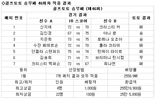 [골프토토] 승무패 46회차 적중결과… 총 38명 7매치 승/무/패 정확히 맞혀. 배당률 2558.9배 기록…1천원 베팅한 적중자 4명 255만원 가져가 LPGA '에비앙 마스터즈' 1라운드를 대상으로 한 골프토토 승무패 게임 46회차에서 총 38명의 적중자가 나왔다. 체육진흥투표권 수탁사업자인 스포츠토토(www.sportstoto.co.kr)는 지난 23일 부터 24일까지 프랑스 에비앙레펭에서 벌어진 LPGA '에비앙 마스터즈' 1라운드를 대상으로 한 골프토토 승무패 46회차 게임에서 7개의 매치 결과를 정확히 맞힌 골프팬이 모두 38명 나와 각각 베팅금액의 2,558.9배에 해당하는 적중상금을 가져가게 됐다고 밝혔다. 상금랭킹 순으로 14명을 선정, 2명씩 7개 매치로 나눠 각 매치별로 1라운드 최종 승무패를 예상하는 방식으로 진행된 이번 게임에서는 신지애-크리스티 커(패), 김인경-야니 챙(승), 지은희-로레나 오초아(승), 수잔 페테르손-폴라 크리머(패), 안젤라 스탠퍼드-린제이 라이트(패), 김송희-브리타니 린시컴(무), 크리스티 맥퍼슨-최나연(패) 등의 결과가 나왔다. 각 매치의 승-무-패를 정확히 맞힌 적중자들 가운데 1천원을 베팅한 4명의 골프팬은 이번 회차 최고액인 255만 8,900원의 상금을 가져가는 기쁨을 맛보게 됐다. 또한 최소 베팅액인 100원을 베팅한 22명의 적중자들에게는 각각25만 5,890원의 상금이 각각 지급된다. 한편, 지난 23일과 24일에 걸쳐 캐나다 온타리오에서 열린 PGA RBC 캐나디언 오픈을 대상으로 한 골프토토 승무패 47회차와 골프토토 스페셜 56회차는 대상선수의 1라운드 미종료로 인해 회차가 취소됐다.