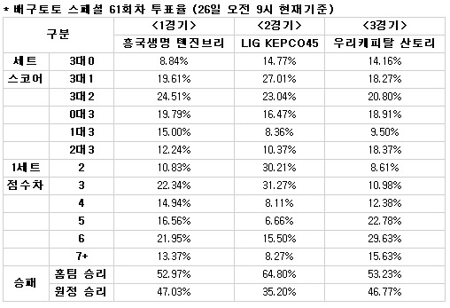 [배구토토]2009 부산 IBK 기업은행 국제배구대회 대상 배구토토 스페셜 61회차 중간집계, 최종 세트스코어 및 1세트 점수차 맞히기…27일 오후 1시 50분 발매 마감 국내 배구팬들은 '2009 부산 IBK 기업은행 국제배구대회' 흥국생명-톈진브리전에서 흥국생명의 우세를 점쳤다. 스포츠토토 공식 온라인 발매사이트인 베트맨(www.betman.co.kr)은 오는 27일에 치러지는 '2009 부산 IBK 기업은행 국제배구대회' 흥국생명-톈진브리, LIG-KEPCO45, 우리캐피탈-산토리 등 3경기를 대상으로 한 배구토토 스페셜 61회차 게임 투표율 중간집계 결과 1경기 흥국생명-톈진전에서 흥국생명의 승리에 52.97%가 투표해 흥국생명의 근소한 우세를 전망한 것으로 나타났다고 밝혔다. 배구토토 스페셜은 게임은 더블(2경기 대상) 및 트리플(3경기 대상) 등 두 가지 방식으로 진행되며 각 경기의 최종세트스코어와 1세트 점수차를 예상하면 된다. 최종세트스코어는 3:0, 3:1, 3:2, 0:3, 1:3, 2:3 등 6개 항목으로 구성되며 1세트 점수차 표기방식은 2점차, 3점차, 4점차, 5점차, 6점차, 7점차 이상 등 6가지로 구분된다. 흥국생명-톈진전 최종 세트스코어는 흥국생명의 3-2 승리(24.51%)가 1순위를 차지했다. 1세트 점수차의 경우 3점이 22.34%로 가장 많았고 6점(21.95%)과 5점(16.56%)이 뒤를 이었다. 2경기 LIG-KEPCO450은 홈팀 LIG(64.80%)가 원정팀 KEPCO45(3520%)에 완승을 거둘 것으로 예상한 참가자가 다수를 차지했다. 최종 세트스코어는 LIG의 3-1 승리(27.01%)와 3-2 승리(23.04%)를 예상한 참가자가 많았다. 1세트 점수차의 경우 3점이 31.27%로 가장 많았고 2점이 30.21%로 그 뒤를 이었다. 3경기 우리캐피탈-산토리전은 홈팀 우리캐피탈의 승리에 53.23%의 참가자가 투표했다. 최종 세트스코어로는 우리캐피탈의 3-2 승리 20.80%와 산토리 3-0 승리(18.91%)를 점친 참가자가 많았다. 1세트 점수차는 6점차가 29.63%로 가장 많았고 5점 22.78%가 그 뒤를 이었다. 한편 이번 배구토토 스페셜 61회차 게임은 오는 27일(월) 오후 1시 50분에 발매 마감된다.
