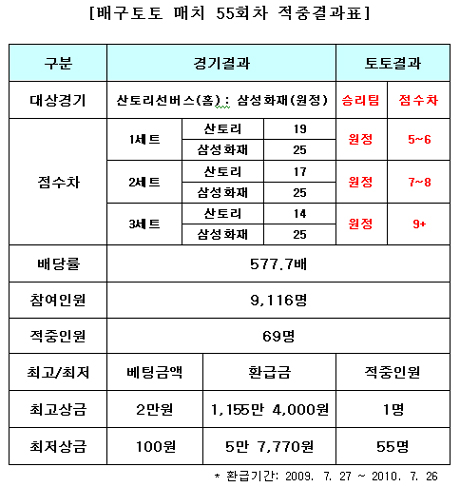 삼성화재 산토리선버스에 가볍게 3세트 따내…배당률 577.7배 나와 2009 부산 IBK기업은행 국제배구대회 산토리선버스와 삼성화재의 경기를 대상으로 하는 배구토토 매치 55회차 게임에서 98명의 적중자가 나왔다. 체육진흥투표권 수탁사업자인 스포츠토토(www.sportstoto.co.kr)는 지난 26일 부산 사직실내체육관서 벌어진 2009 부산 IBK기업은행 국제배구대회 산토리선버스-삼성화재전을 대상으로 시행한 배구토토 매치 55회차 게임에서 총 98명의 적중자가 나와 각각 베팅 금액의 577.7배에 해당하는 적중상금을 받게 됐다고 밝혔다. 배구토토 매치는 1개 경기의 1~3세트 세트별 승리팀과 점수차를 예상하여 맞히면 되며 게임은 1~3세트별 승리팀 2개항목(홈, 원정)과 점수차 5개 항목(2점차, 3~4점차, 5~6점차, 7~8점차, 9+점차)로 구성된다. 이번 산토리선버스-삼성화재전에서는 1세트 원정팀 삼성화재 승리(19-25, 점수차: 5~6점), 2세트 원정팀 삼성화재 승리(17-25, 점수차 : 7~8점), 3세트 원정팀 삼성화재 승리(14-25, 점수차 : 9+) 등의 결과가 나왔다. 배구토토 매치 55회차 적중자 가운데 2만원을 베팅한 1명의 배구팬은 이번 회차 최고액인 1155만 4000원의 적중상금을 가져가게 됐다. 최소 베팅액인 100원을 베팅한 55명의 적중자들에게는 각각 5만 7770원씩 돌아간다. '즐거운 스포츠, 즐거운 토토'(http://www.betman.co.kr)